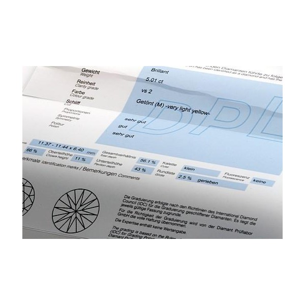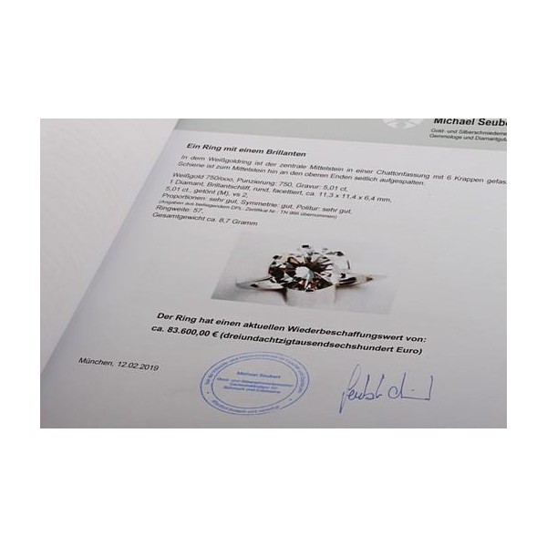 Übrigens: Achten Sie beim Kauf eines größeren Diamanten möglichst darauf, dass dieser mit Expertise z.B. von DPL, GIA, IGI oder HRD geliefert wird, da es sonst oft zu unangenehmen Qualitätsüberraschungen kommt. Ebenso zum Lieferumfang gehört das 9-seitige Wertgutachten des von der Industrie-und Handelskammer für München und Oberbayern öffentlich bestellten und vereidigten Sachverständigen Seubert (München). Es weist einen Wiederbeschaffungswert von 83.600€ aus. Da der Wert sehr nüchtern kalkuliert wurde, und Brillanten über 5ct meist nur noch bei Nobel-Juwelieren an erlesenen/teuren Standorten (zusätzlich hohe Personalkosten) zu finden sind, so werden deswegen oft Preise verlangt, die deutlich über dem angegebenen Wiederbeschaffungswert liegen. An der Ansicht eines hochwertigen Fünfkaräters erfreut man sich ein Leben lang. Ein schöner, seltener Brillant-Solitär eignet sich zu jedem Anlass blendend als Geschenk. Wie sagt man so schön: "Diamonds are the girls´ best friend"...