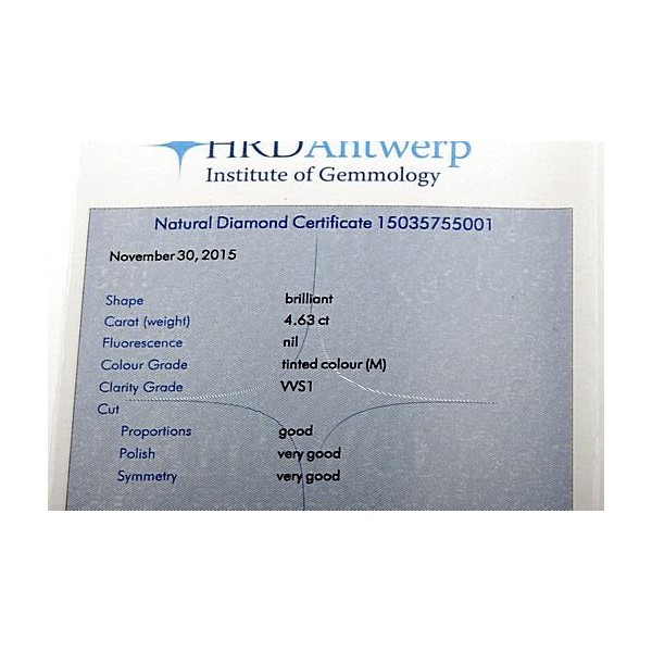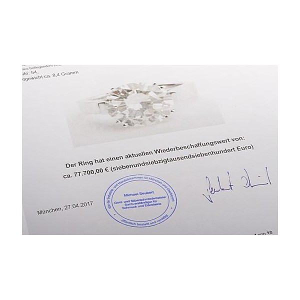 Dieser traumhaft schöne, noch ungetragene Brillantring in 18 Karat (750er) Weißgold stammt aus dem Nachlass eines Edeljuweliers, der sein Geschäft aus Altersgründen aufgab. Er wurde einst mit 77700€ angeboten und kann hier weit unter Preis erstanden werden, da wir nicht wie Juweliere kalkulieren müssen. Nur ein geringer Prozensatz aller weltweit geförderten Diamanten ist überhaupt für die Schmuckbranche geeignet, da für diese schon ein sehr gutes Mindest-Qualitätsmaß vorhanden sein muss. Häufig sieht man hier aber Diamanten, die entweder schlecht in der Farbe oder auch in der Reinheit sind. Dass man einen Diamanten, der dann durch den Brillantschliff zum "Brillanten" wird, in der Kombination Farbe M und der Reinheit Vvsi1 (entspricht einer Stufe nach lupenrein) findet wie hier, wird mit steigendem Carat-Gewicht immer seltener. Sehen Sie sich einmal um, einen qualitativ vergleichbaren Vierkaräter werden Sie, wenn überhaupt, nur sehr selten einmal finden. Dann aber meist zu "anderen" Preisen... Der edle Brillant-Solitär wiegt 4,63ct und besticht durch seine hervorragenden Qualitätseigenschaften (M/Vvsi1, Proportion: Gut, Schliff: Sehr gut, Symmetrie: Sehr gut). Nicht nur aufgrund seiner feinen Reinheit (Vvsi1), sondern auch wegen seines sehr guten Schliffs und der sehr guten Symmetrie zeigt der Solitär eine überwältigende Brillanz und reflektiert einfallendes Licht in all seinen Spektralfarben. Die äußerst edle Handarbeits-Fassung macht das Kunstwerk perfekt. Zur Sicherheit wurde der Mittel-Brillant mit 4 Doppel-Stotzen gefasst. Dass es sich bei diesem massiv gearbeiteten Brillantring in 18 Karat Weißgold um ein feines Unikat handelt, bräuchte nicht erst erwähnt zu werden. Wer diesen glitzernden Solitär einmal in Natura gesehen hat, der möchte diesen traumhaften Anblick nicht mehr missen. Sie erhalten zum Ring natürlich die Expertise (diamond certificate) des weltweit anerkannten Instutut of Gemmology HRD Antwerp (Belgien). Übrigens: Achten Sie beim Kauf eines größeren Diamanten möglichst darauf, dass dieser mit Expertise z.B. von HRD, GIA, IGI oder DPL geliefert wird, da es sonst oft zu unangenehmen Qualitätsüberraschungen kommt. Ebenso zum Lieferumfang gehört das 10-seitige Wertgutachten des von der Industrie-und Handelskammer für München und Oberbayern öffentlich bestellten und vereidigten Sachverständigen Seubert (München). Es weist einen Wiederbeschaffungswert von 77.700€ aus. Da der Wert sehr nüchtern kalkuliert wurde, und Brillanten über 4ct meist nur noch bei Nobel-Juwelieren an erlesenen/teuren Standorten (zusätzlich hohe Personalkosten) zu finden sind, so werden deswegen oft Preise verlangt, die deutlich über dem angegebenen Wiederbeschaffungswert liegen. An der Ansicht eines hochwertigen Vierkaräters erfreut man sich ein Leben lang.