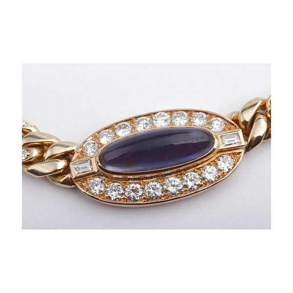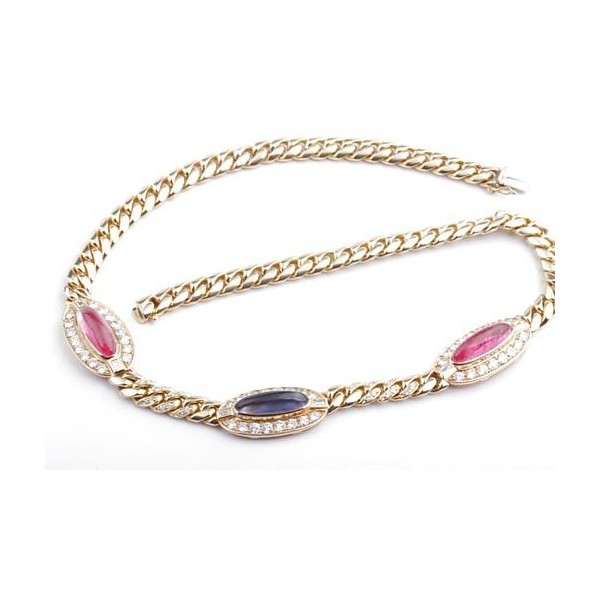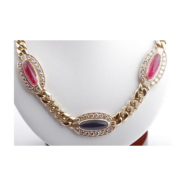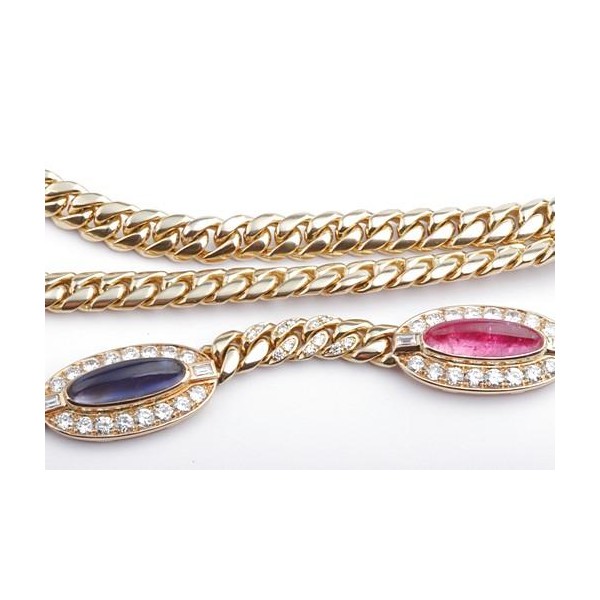 Hochfeines Collier in 750er Gelbgold, integriert 3 Mittelstücke besetzt mit 1 Iolith (3,30ct), 2 rosa Turmaline (9,32ct) jeweils in feiner Farbe im Cabochonschliff, zusätzlich 48 Brillanten von zus. ca. 2,88ct, 6 Baguette-Diamanten von zus. ca. 0,36ct, alle Diamanten in feinem Weiß (Top Wesselton) und Reinheit Vvsi.