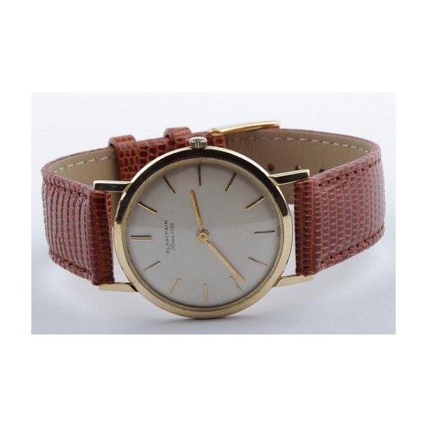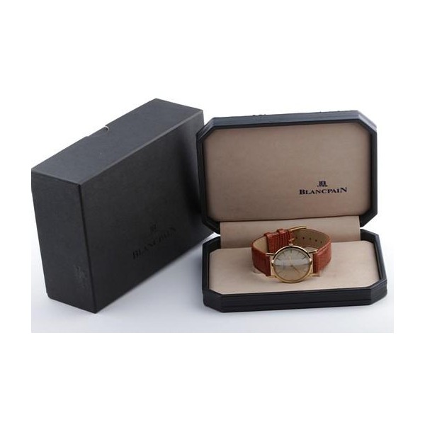 Hier zu sehen ist eine hochfeine Armbanduhr mit Handaufzug in 750er Gelbgold aus dem noblen Hause Blancpain.