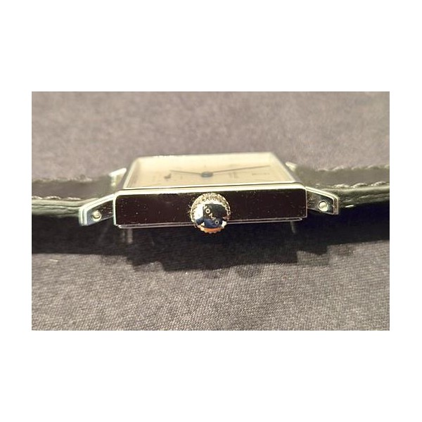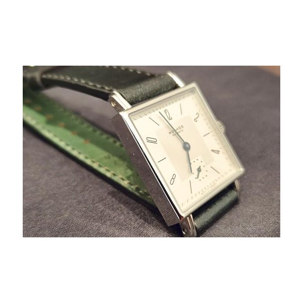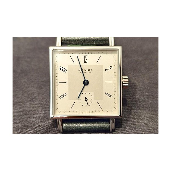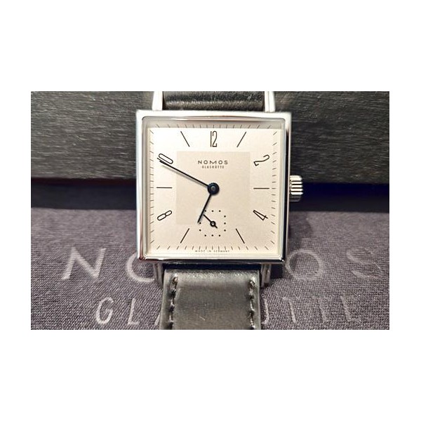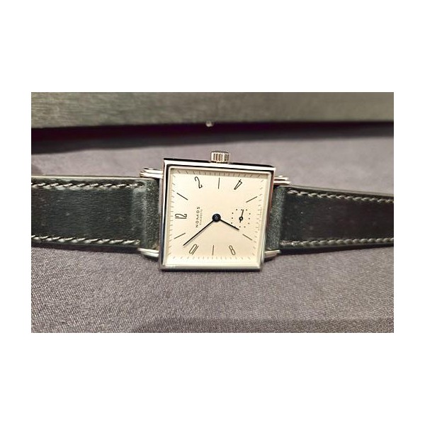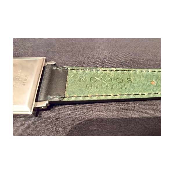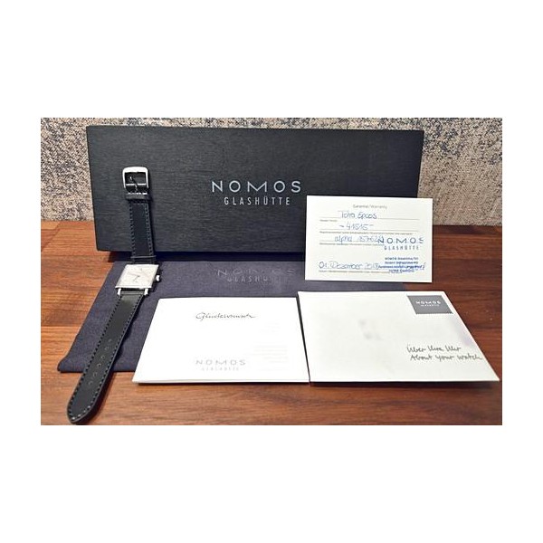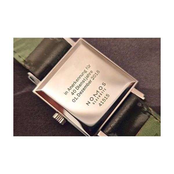 Diese schöne Nomos Glashütte Damenuhr kommt im Full-Set und absolut ungetragenem Zustand, Sie war ein Geschenk zum 40-jährigen Dienstjubiläum, was auf der Rückseite eingraviert wurde (der Name wurde aus Datenschutzgründen wegretuschiert). Das Handaufzugswerk funktioniert tadellos. Die Uhr hat einen Durchmesser von ca. 28mm und das Gehäuse ist aus Edelstahl gefertigt. Das schwarze Lederband ist original von Nomos Glashütte und ungetragen. Nutzen Sie die Gelegenheit!