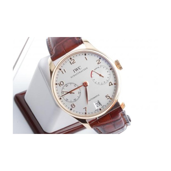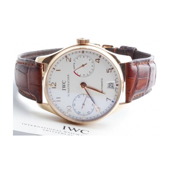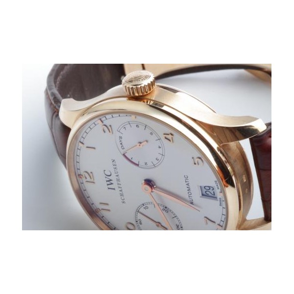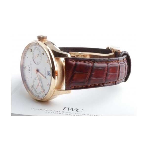 IWC Portugieser Automatik in Topzustand, Gehäuse und Schließe in 18K Gold, 7-Tage Gangreserve mit Anzeige auf 3 Uhr (168 Stunden), Sichtboden, Datumsanzeige auf 6 Uhr, kleine Sekunde auf 9 Uhr, Durchmesser 42mm, inkl. original Box und Papiere von 2005.