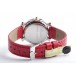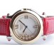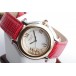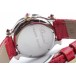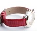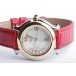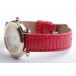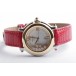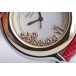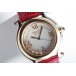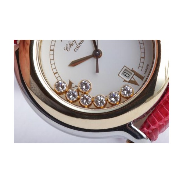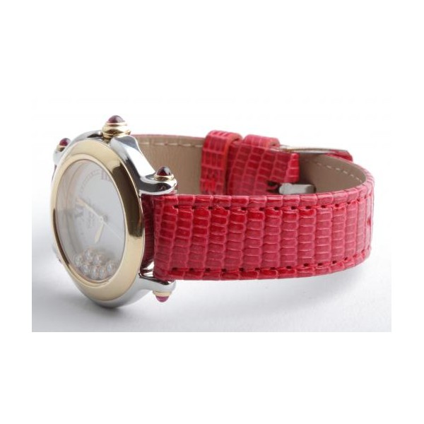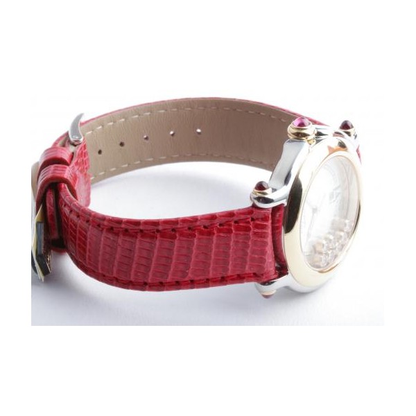 Zu sehen ist die hochfeine Damenuhr Happy Sport aus dem noblen Hause Chopard. Charakteristisch für dieses Modell sind die beweglichen Diamanten auf dem Zifferblatt, die ein glitzerndes Schauspiel der besonderen Art liefern und Damenherzen begeistern. Die Uhr stammt aus den frühen 2000er Jahren und befindet sich, wie auf den Bildern zu erkennen, in gepflegtem Zustand. Die Schließe ist original von Chopard, das rote Eidechsenarmband ist neutral und neu, es passt hervorragend zu den 5 Rubinen im Cabochon-Schliff auf dem Gehäuse.