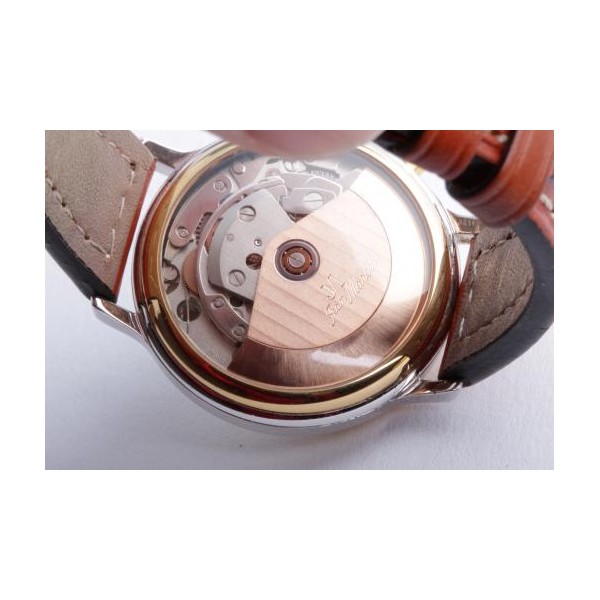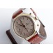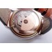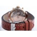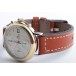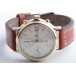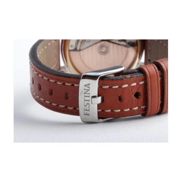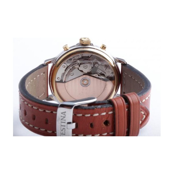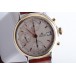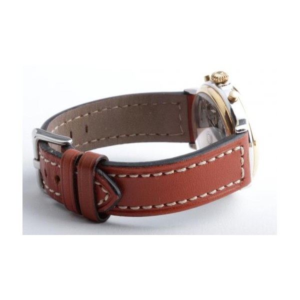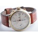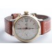 Lünette 18kt Gelbgold, Armband Leder braun mit Ziernaht (Marke Festina), Anstoßbreite 18mm, Zifferblatt silber mit gelbgoldenen Indices und gelbgoldenen Zeigern. Uhrwerk Automatik, Chronograph, Kaliber Valjoux 7750 mit 17 Edelsteinen. Anzeige von Stunde und Minute über Zeiger aus der Mitte, kleine Sekunde mit Sekundenstopp zur sekundengenauen Einstellung der Uhrzeit bei 9 Uhr, Datumsanzeige mit Schnellverstellung bei 3 Uhr. Saphirglas kratzfest. Zwiebelkrone mit Flankenschutz. Boden Edelstahl verschraubt, graviert mit Saphirglas Sichtfenster.