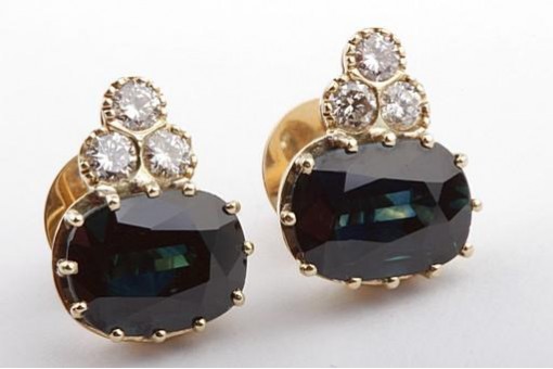 Besetzt wurden die schönen Ohrringe mit zwei sehr großen Saphiren von zus. ca. 9,2ct. Jeder der beiden Saphire wird ergänzt von je 3 feinen Brillanten. Wahrlich ein Design, welches man nicht alle Tage sieht. Saphire dieses Gewichts und dieser intensiven, dunkelblauen Farbe findet man nicht sehr häufig. Besonders in Zeiten des Massenfabrikschmucks erfreut sich das Auge umso mehr an einer feinen Goldschmiedearbeit wie der diesen.