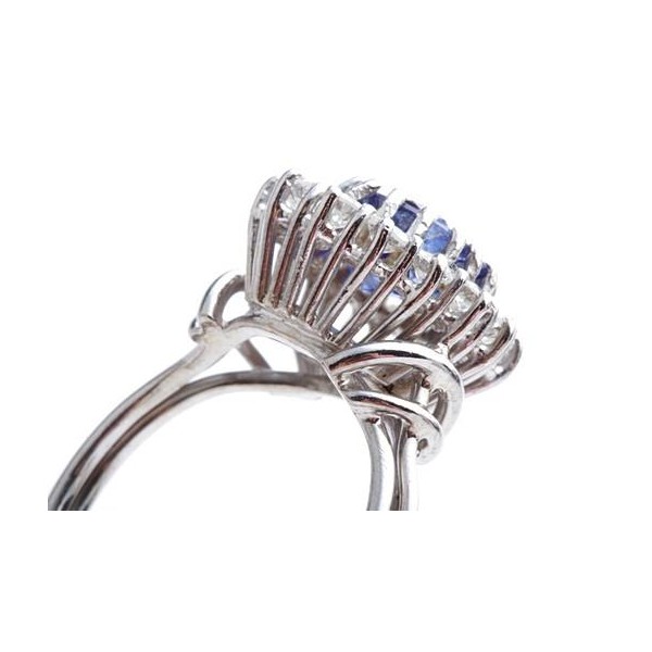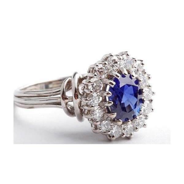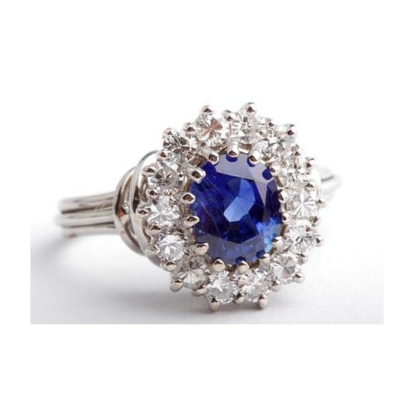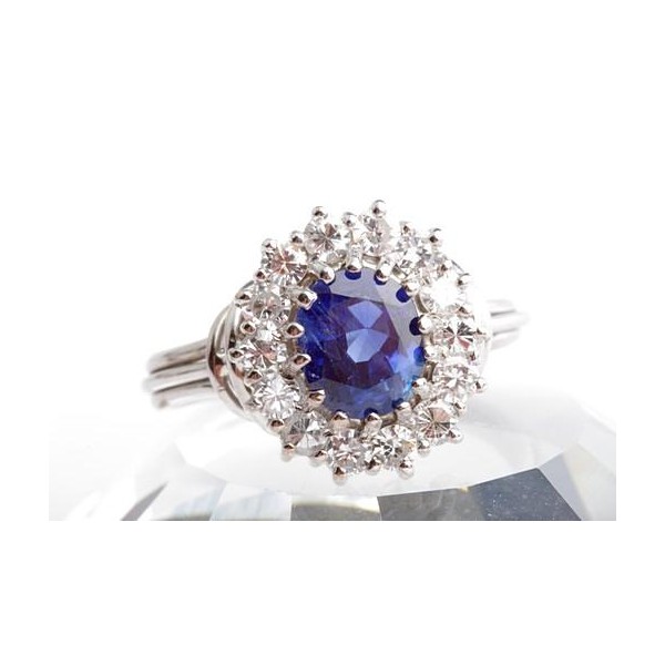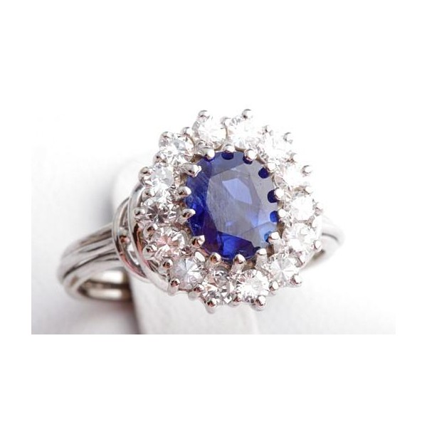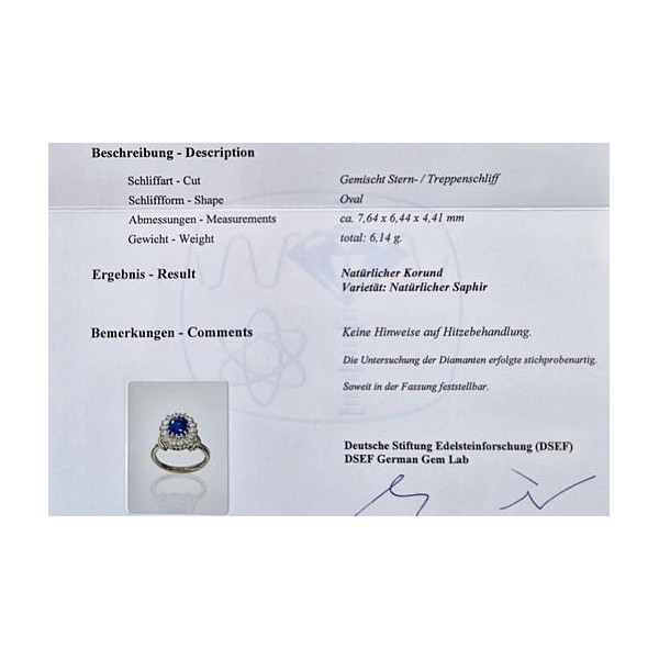 Traumhafter Saphir-Ring mit Brillanten. 1 unbehandelter Saphir (Ceylon) ca. 1,65ct in wundervoller blauer Farbe mit DSEF Gutachten (Deutsche Stiftung Edelsteinforschung), gefasst in 18-karätigem Weißgold und umrundet von 14 Brillanten zus. ca. 0,70ct in sehr guter Qualtität (G/VVSi). Die meisten Saphire sind wärmebehandelt, um die Farbe zu intensivieren, dieser ist jedoch unbehandelt!