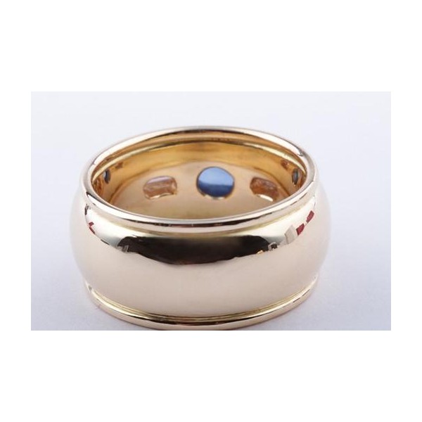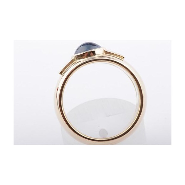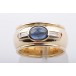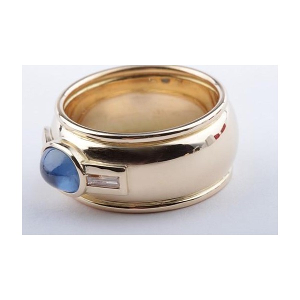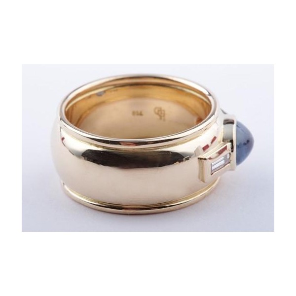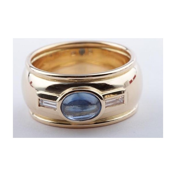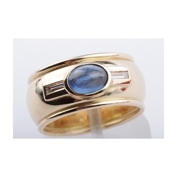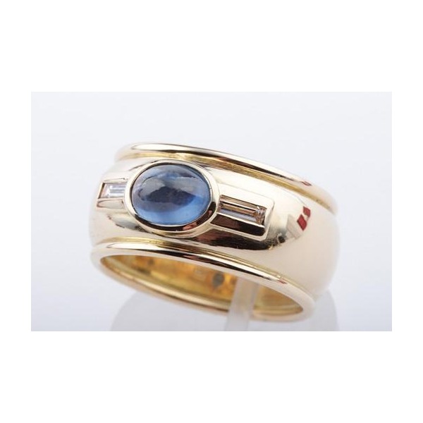 Dann werfen Sie doch einen näheren Blick auf diesen bezaubernden Ring in 750er Gelbgold, der mit einem schönen Saphir im Cabochon-Schliff und mit zwei feinen Baguette-Diamanten bestückt wurde.