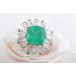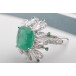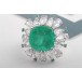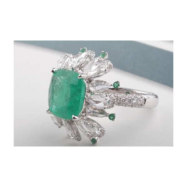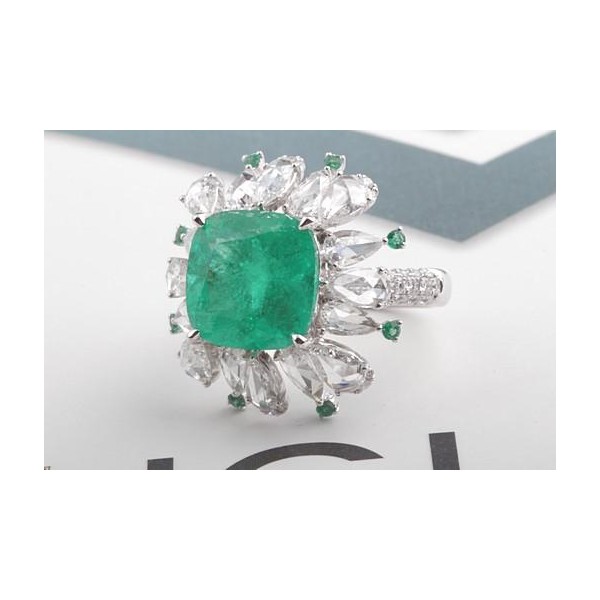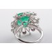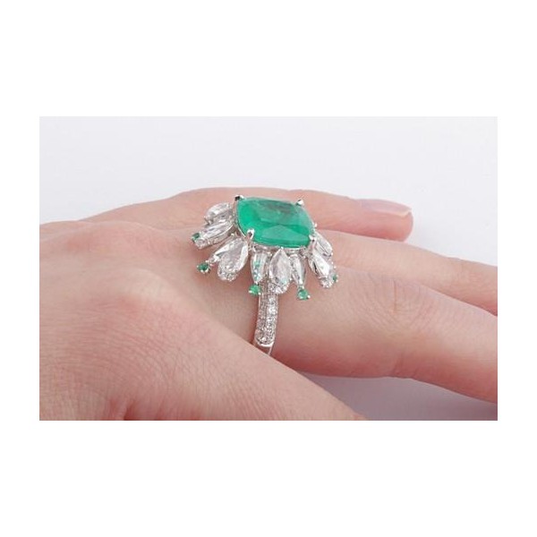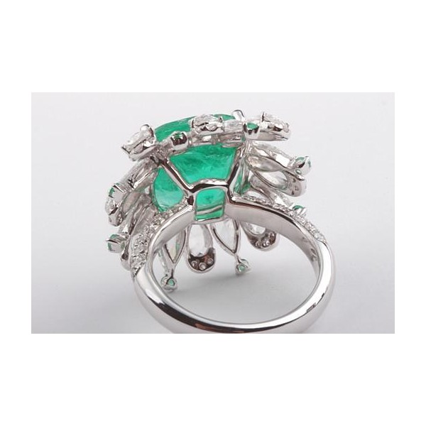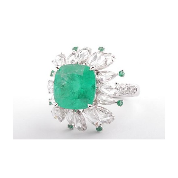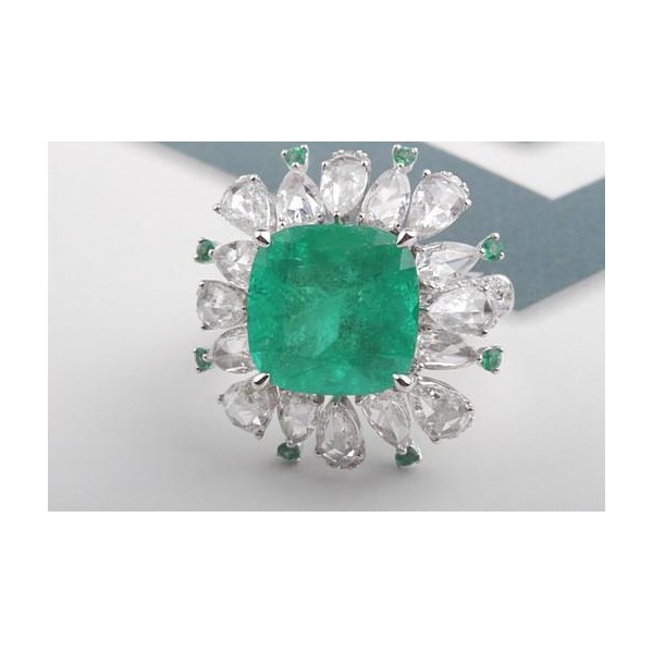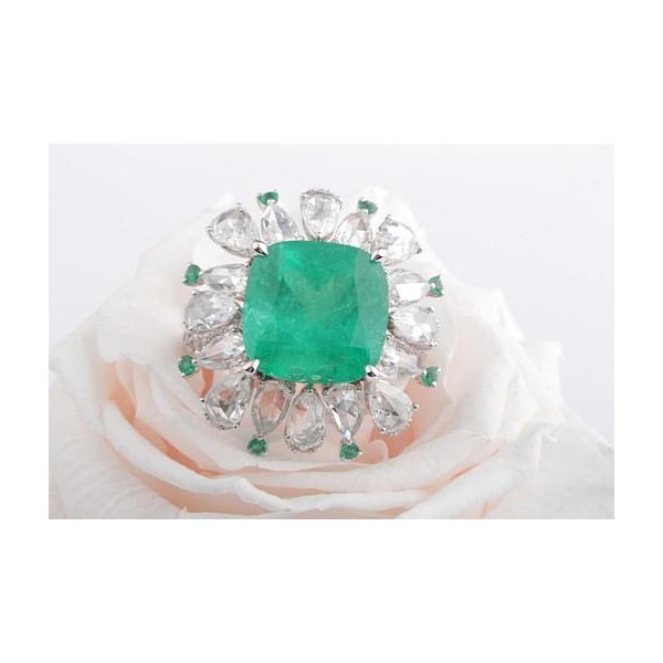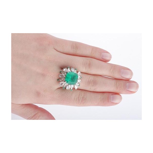Wundervolle Handarbeit in 750er Weißgold, zentral ein hochfeiner Smaragd aus Kolumbien von 7,38ct, intensives Grün/bläulich, transparent, natürliche Einschlüsse, umrandet von 16 Diamanten im Pear Rose Cut (zus. ca. 2,86ct), weitere kleine Smaragde (zus. ca. 0,14ct), 70 Brillanten (zus. ca. 0,72ct).